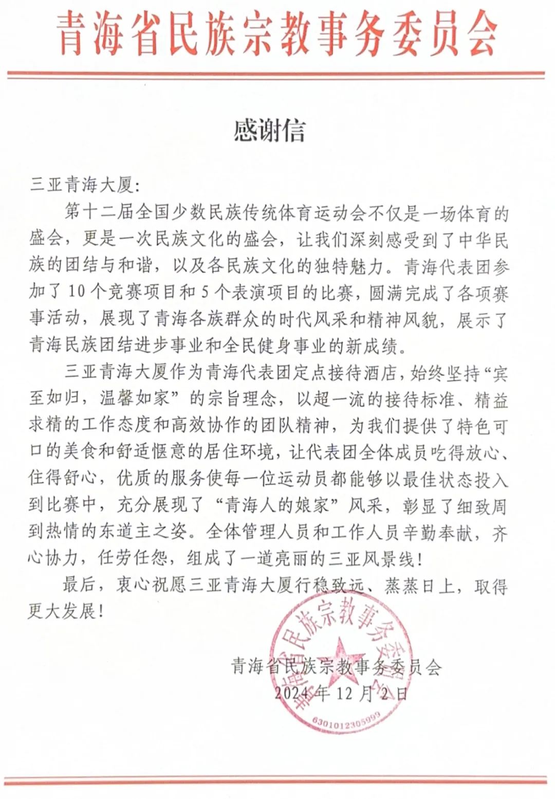“特色可口的美食和舒适惬意的居住环境,让代表团全体成员吃得放心住得舒心,优质的服务使每一位运动员都能够以最佳状态投入到比赛中,充分展现了‘青海人的娘家’风采。”12月2日,青海省民族宗教委员会向西部矿业所属三亚青海大厦发来感谢信,对三亚青海大厦在第十二届全国少数民族传统体育运动会期间作为青海代表团指定接待酒店,以超一流的接待标准、精益求精的工作态度和高效协作的团队精神,为青海代表团提供的周到服务表示感谢。同时,三亚市退役军人事务局、第十二届全国少数民族传统体育运动会青海代表团也送来锦旗,感谢三亚青海大厦的周到服务。