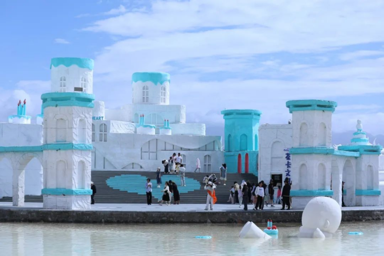 盐雕广场气势恢宏的主题盐雕作品吸引着游客驻足。这些以“成吉思汗”“景颇族”等为主题的雕塑,被世界纪录协会认证为“世界最大户外盐雕艺术群”,总面积达3万平方米,指尖轻抚过斑驳纹路,仿佛能触摸到千年历史的温度。取之于盐湖,装扮于盐湖,盐雕在带给游客最佳观光体验的同时,将地方特色与生态理念结合的巧妙设计成为茶卡盐湖的独特景观。