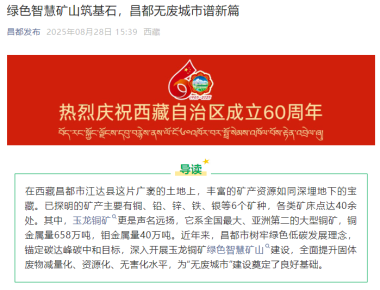 在西藏昌都市江达县这片广袤的土地上,丰富的矿产资源如同深埋地下的宝藏。已探明的矿产主要有铜、铅、锌、铁、银等6个矿种,各类矿床点达40余处。其中,玉龙铜矿更是声名远扬,它系全国最大、亚洲第二的大型铜矿,铜金属量658万吨,钼金属量40万吨。近年来,昌都市树牢绿色低碳发展理念,锚定碳达峰碳中和目标,深入开展玉龙铜矿绿色智慧矿山建设,全面提升固体废物减量化、资源化、无害化水平,为“无废城市”建设奠定了良好基础。