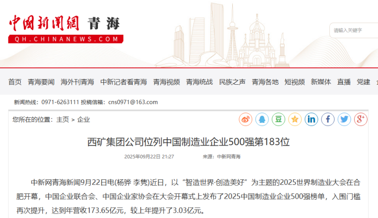 西部矿业集团以营业收入687.96亿元入围中国制造业企业500强,排名第183位,较上年提升28位。
