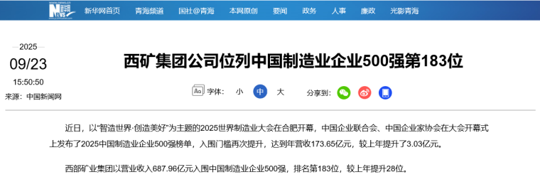 西部矿业集团以营业收入687.96亿元入围中国制造业企业500强,排名第183位,较上年提升28位。