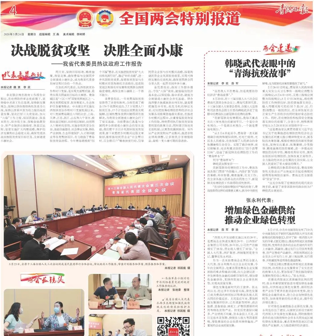 5月28日下午,十三届全国人大三次会议在北京胜利闭幕。这是张永利代表第三次参加全国两会。作为我省唯一一名来自企业的全国人大代表,不论是在小组讨论发言、建言献策、递交建议,还是接受媒体采访,张永利代表时刻把青海企业发展放在心上、扛在肩上,条条建议紧扣青海企业实际,为青海企业高质量发展代言,充分展现了全国人大代表忠诚为民履职的使命担当和昂扬奋进的精神风貌。今天,小编梳理了一些“关键词”,一起来看看张永利代表的两会之“履”。