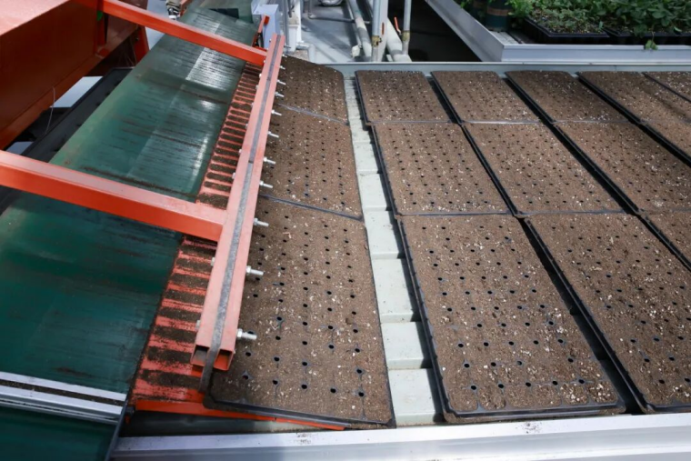 穴盘入床机将点种后的穴盘整齐码上苗床