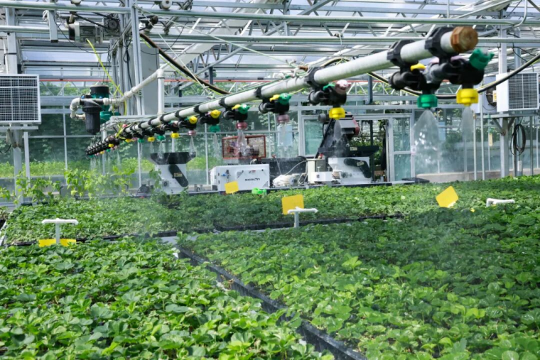 在这里,所有种植棚全部智能化管理,通过手机一键操作便能实时监测作物生长情况,为灌溉、施肥等提供依据。比如一座种植棚内达到一定温度后,棚顶的遮阳幕帘会自动展开,风扇、水帘也会同步工作进行降温。室外艳阳高照,棚内的西红柿、草莓等农作物却撑起了“遮阳伞”,吹起了“电风扇”。不仅有“恒温住宅”,“水肥一体化系统”还会定时对农作物进行自动化精准“投喂”。
