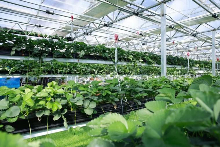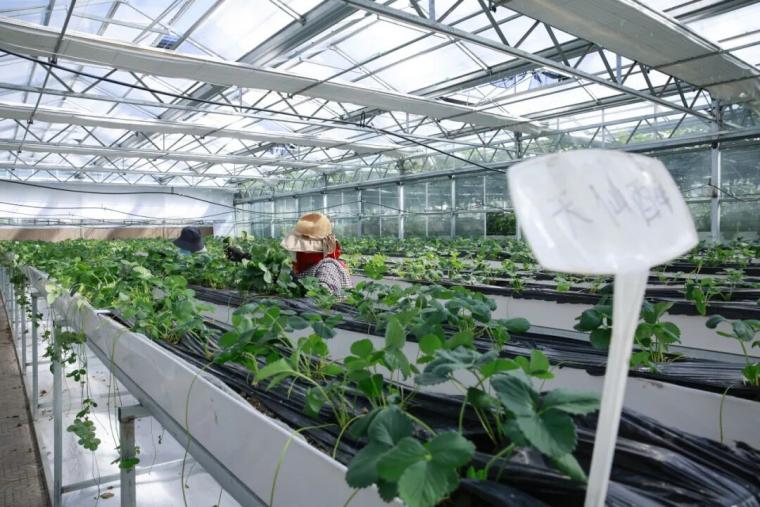 不远处的草莓种苗床,各类品种的草莓幼苗舒展着嫩绿的叶片,一排排整齐排列在“空中”,技术人员手持间苗工具穿梭其间,小心翼翼地拔除弱苗,确保每株幼苗都有充足生长空间。阳光透过玻璃穹顶洒下,与自动喷灌系统喷出的细密水雾交织成虹,映照着幼苗蓬勃的生机。