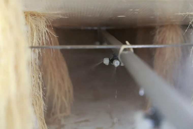 种植大棚中,饱满的西红柿挂在藤蔓上,阳光洒下时泛着诱人的光泽。不同于土培,它们的根系悬挂在封闭不透光的空间里,喷雾装置将营养液化作细密雾滴,轻柔地滋润根系,精准输送水分与养分。