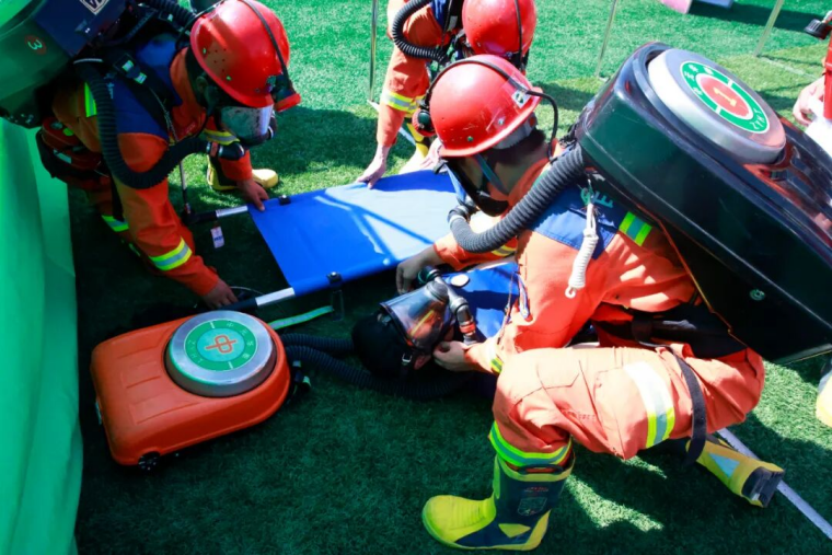 “进入现场,发现伤员……”“伤员左小腿受伤,请携带设备救援!”心肺复苏和现场急救环节,环境评估、呼唤伤员、检查呼吸、心肺复苏、指压止血、螺旋反折包扎、搬运伤员……参赛选手操作流畅、一气呵成,展现出扎实基本功、规范流程和良好团队协作。“装备”“齐全”“仪器”“完好”,小队长与队员间的铿锵对话拉开了模拟救灾环节,此次模拟矿山井下巷道电缆起火,1名工人被困,小队长担任指挥员,带领5名队员组成救援队实施救援,从接警到施救,全程反应迅速、处置专业,“快、准、稳”的应急救援能力展现的淋漓尽致,充分体现“快速响应、科学指挥、高效协同、精准救援”的理念。